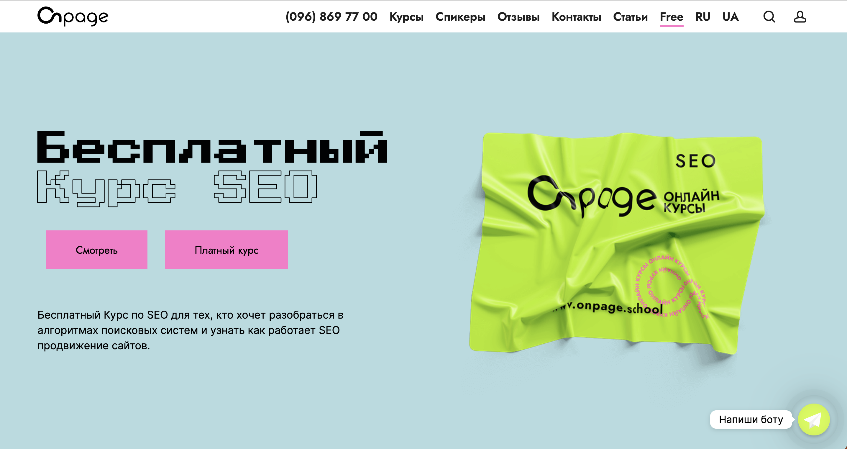 Onpage School — це сучасна освітня платформа, яка пропонує курси з інтернет-маркетингу, реклами, SEO, SMM, дизайну, фінансів, створення веб-сайтів та цифрових продуктів серед інших тем. Вони надають сучасний формат навчання, який включає зручний графік уроків, практичні відеоуроки тривалістю 10-15 хвилин кожен, цікавих лекторів та мікронавчання, яке акцентує увагу на коротких уроках, практичності, емоційності та індивідуальності. Платформа розрахована на осіб, які шукають старт у кар'єрі, професіоналів, які прагнуть покращити свої навички, та бізнеси, які прагнуть оптимізувати свою діяльність. Вони також пропонують безкоштовний курс з SEO.